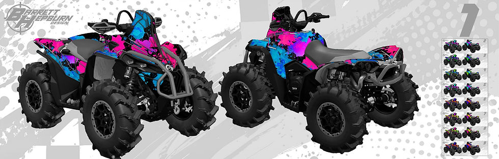 Rev up your ATV build with an original Barrett Hepburn Design vinyl armor wrap kit for SXS, UTV, Sled, Watercraft and ATV. Protective 21 mil vinyl wrap kits for ATV available in in over fifteen finish combinations: Gloss, Matte, Metal Flake Gold, Metal Flake Silver and Metal Flake Color Shift, Gloss-Chrome, Gloss-Holographic, Matte-Chrome, Matte-Holographic, Exotic Metal Flake Chrome: Silver Flake, Exotic Metal Flake Chrome: Gold Flake, Exotic Metal Flake Chrome: Color-Shifting Flake, Exotic Metal Flake Holographic: Silver Flake, Exotic Metal Flake Holographic: Gold Flake, Exotic Metal Flake Holographic: Color-Shifting Flake. Barrett Hepburn Design, BHDWraps graphics and wrap kits are built for extremes - environments, riding and people. Specifically engineered for the off-road 4x4 community and trusted worldwide, we ship globally; our ATV wrap kits are easily self-installed. We're proud to offer the toughest protective vinyl armor on the market. Barrett Hepburn Design, BHDWraps graphics and wrap kits are designed to provide superior protection against wear and tear and take your ATV build to the next level.