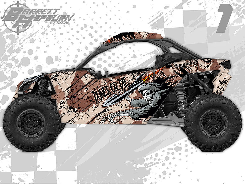 Rev up you build with an original Barrett Hepburn Design protective wrap kit for SXS / UTV. Protective 21 mil vinyl wrap kits available in over eight finish combinations: Gloss, Matte, Metal Flake Gold, Metal Flake Silver and Metal Flake Color Shift; provide superior protection for your ride. (Exotic finishes Chrome, Holographic Chameleon and Exotic Metal Flake available by special request).